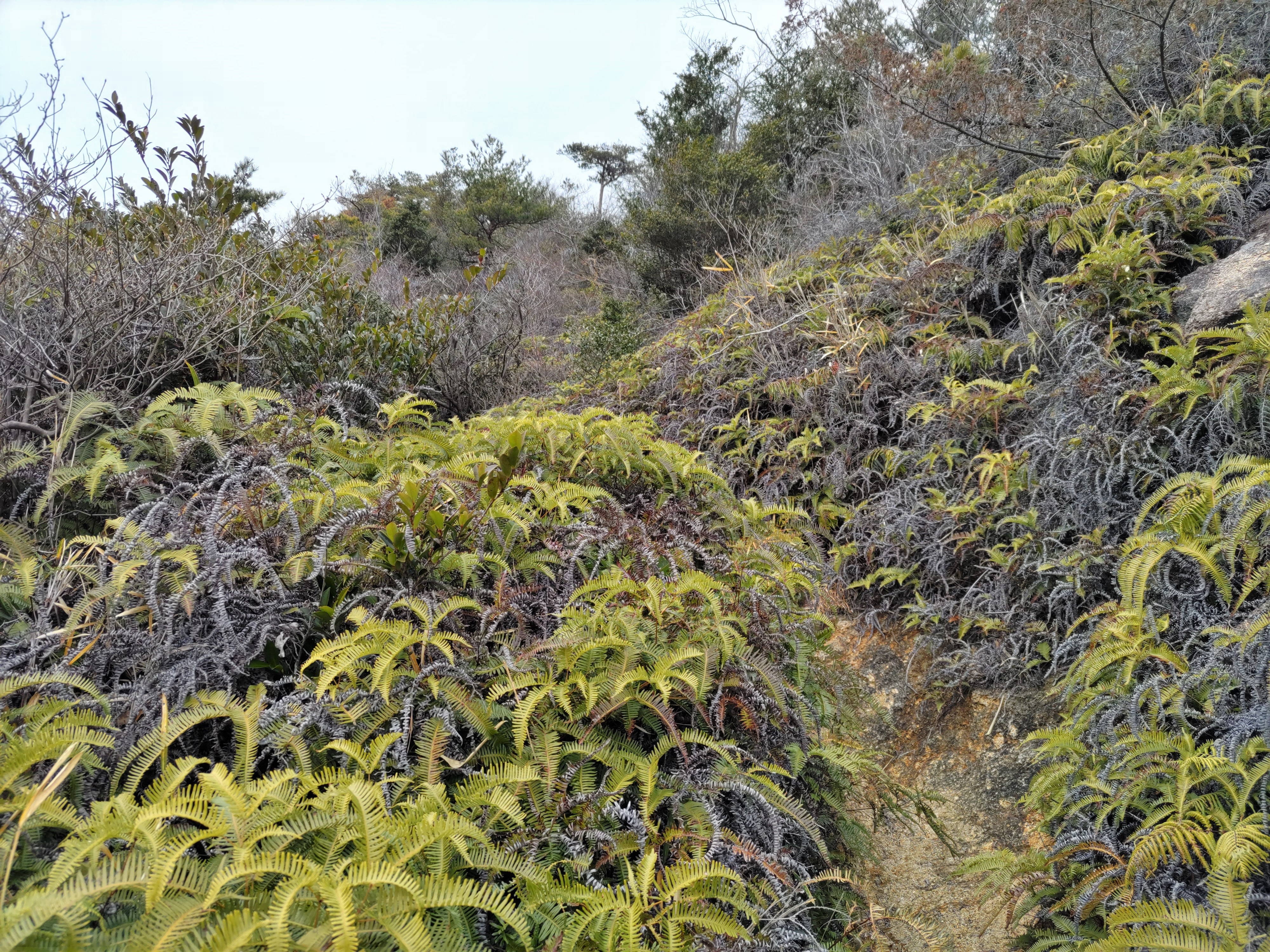東おたふく山から、六甲山への主要登山道である魚屋道へと下りてきた。魚屋道では数少ないベンチが並んでいる雨ヶ峠だ。週末で、まだ2時半だというのに人の姿が見えない。なんだか不気味だ。