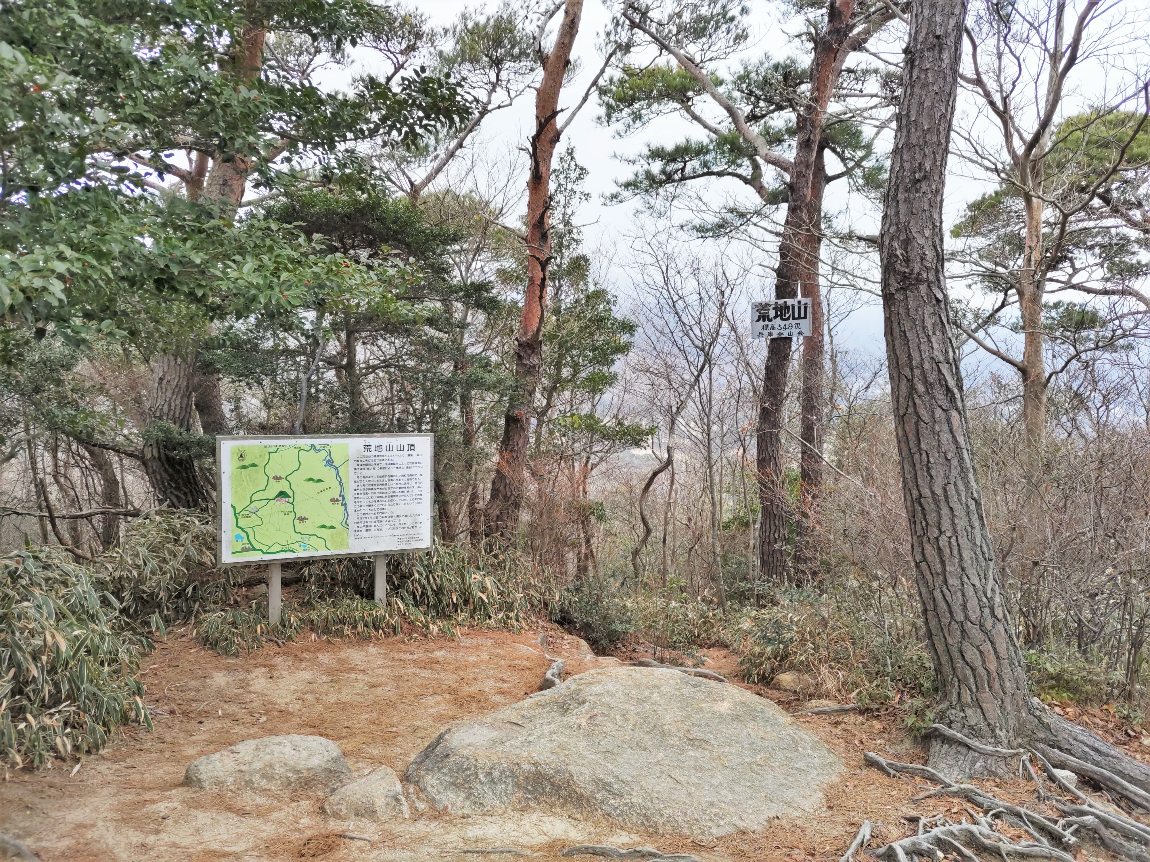 荒地山山頂(549m)。幸い雨は降りやんでいる。天候次第では、無難に魚屋道に出ようかと思っていたけれど、体力も天気も問題ないようなので、計画通りちょっと険しい高座谷を下っていくことにする。