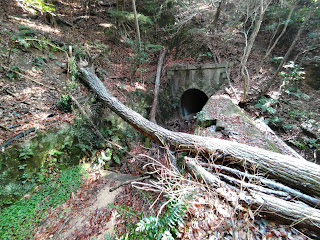 増水時に水を逃がすための隧道も残っている。ちょっと中を覗き込んでみたいと思ったけれど、倒木に塞がれているうえに不気味な雰囲気でもあったので、自重する。