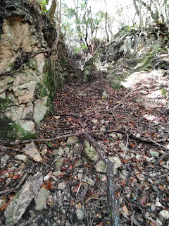さらに道が紛らわしいところにやってきた。結局谷道を進むが、どんどん道が荒れ、さらに勾配がキツくなってきた。かといって登ってきた荒れた谷道を下ることもヤバそうだ。危なそうなら引き返す、というシンプルなことができそうでできない…。